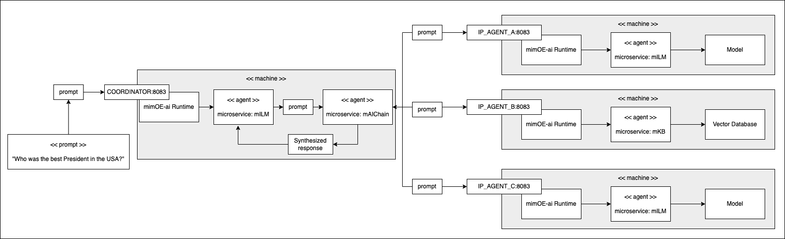 • The role of an Agent Machine is to process a prompt received from a Coordinator Machine. An Agent Machine can run the mILM microservice which submits a prompt to an LLM stored locally on the Agent Machine. Or, the Agent Machine can run mKB microservice which executes a prompt against a vector database stored on the Agent Machine.