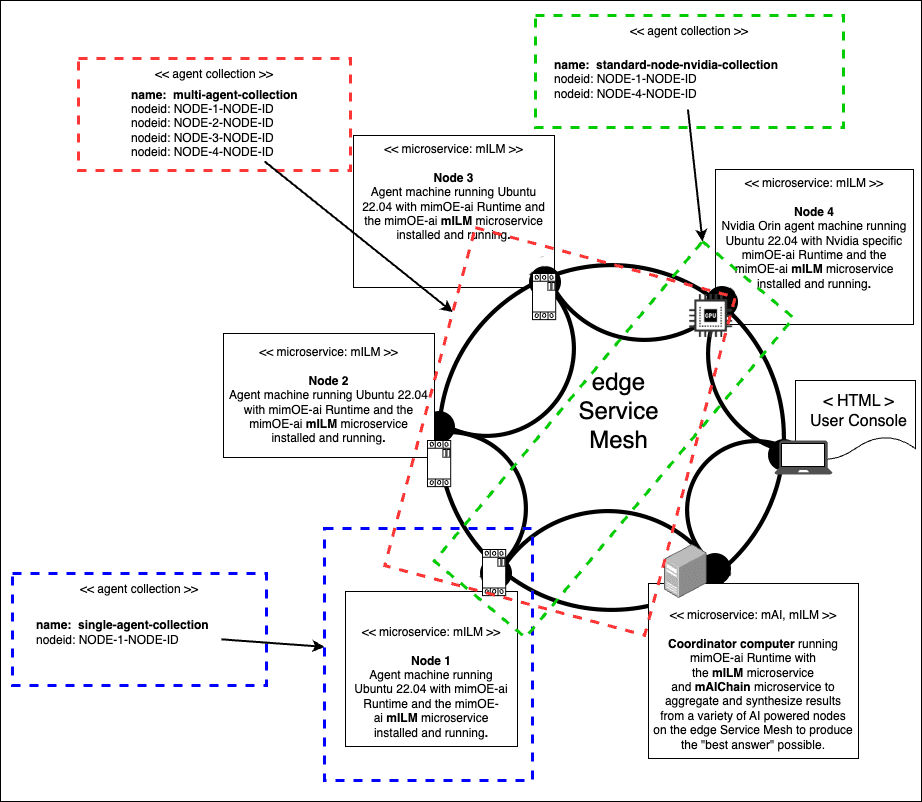 All devices enabled to use mim OE are part of the edge Service Mesh by default. This means that mim OE can support a variety of AI models that are distributed across the network. This allows for AI models to be discovered and used by other devices on the network. AI to AI discovery enables applications to use a cluster of AI models to determine the "best possible response" to a particular prompt.