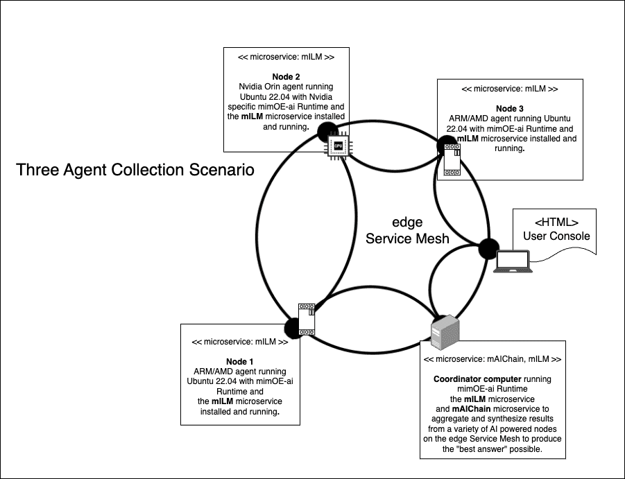 The objective of this tutorial is to demonstrate how to create a Three Agent Collection scenario running under mimik ai. A Three Agent Collection, in this case, is a configuration of mimik ai that has a Coordinator Machine, two AMD/ARM Agent Machine and an Nvidia Orin Nano machine. The Coordinator Machine accepts a prompt from a client and then passes the prompt on the Three Agent Collection for processing.